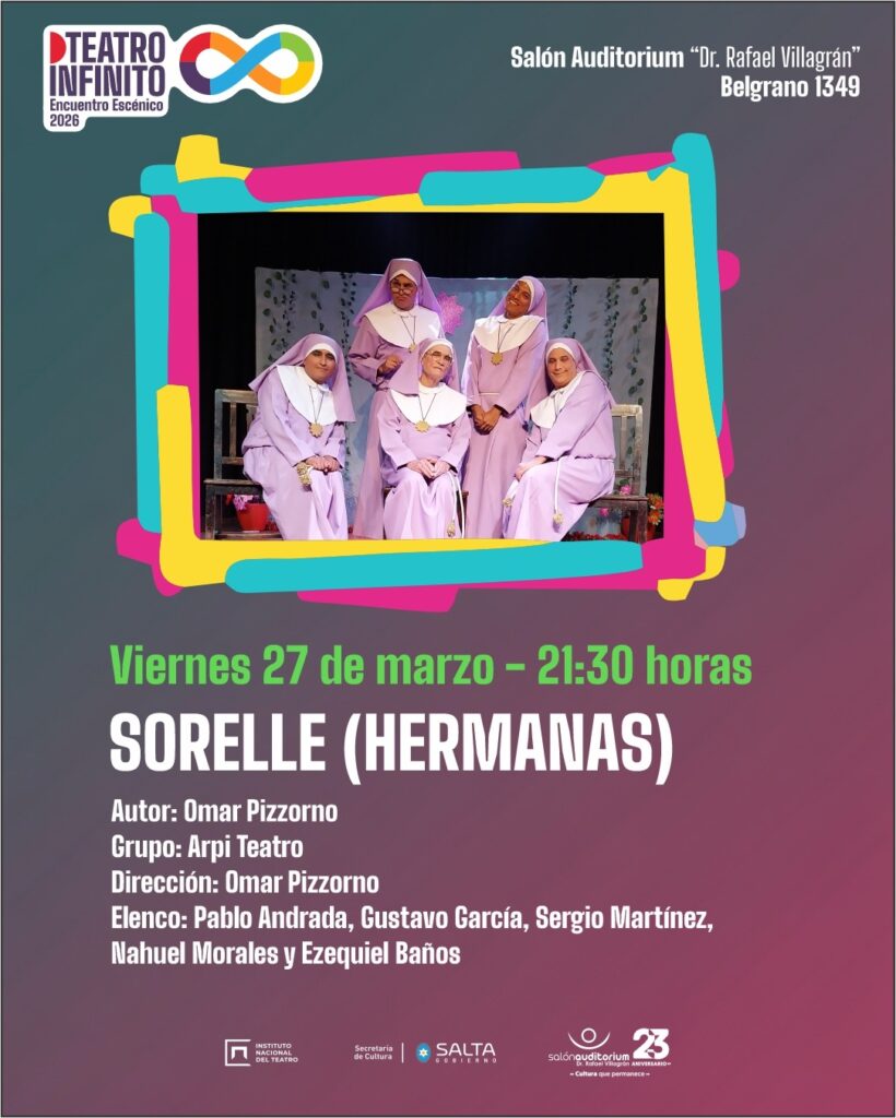 El grupo Arpi Teatro presenta “Sorelle (Hermanas)” en el marco del Encuentro Escénico Teatro Infinito. Con dirección y autoría de Omar Pizzorno, la obra irrumpe en la aparente tranquilidad de un convento con la llegada de una nueva integrante que esconde secretos inesperados, desatando un torbellino de sospechas y carcajadas.